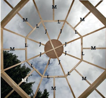 Før vi begynner å legge på taket, skal vi ha satt på loddrette forkantbord. Vi bruker åtte bord, som vi setter fast til sperreendene hele veien rundt lysthuset.