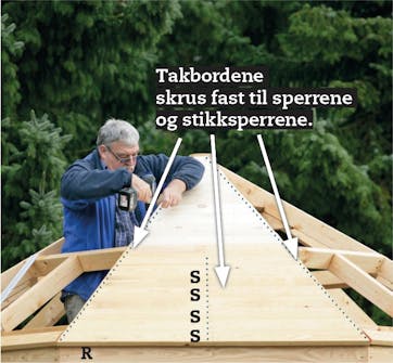Tilpass det nederste bordet (S), og skru det fast. Legg opp 7-8 bord, og slå dem midlertidig sammen i fjær og not. Strek opp fra det nederste bordet, midt over sperrene, før du kapper bordene og skrur dem på med 4 x 60 mm skruer.