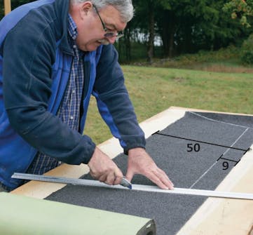 Tegn opp de nederste 50 cm av taket på den første lengden takbelegg. Skjær av de skrå kantene med en hobbykniv. Marker 9 cm overlapp i toppen med kritt, og skjær til belegget.