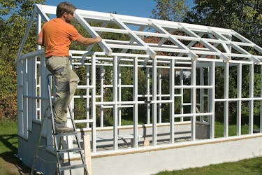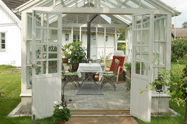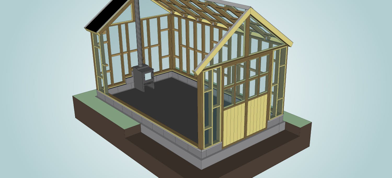 Skjelettet i veggene lages av standardmaterialer, men både de loddrette stolpene og de vannrette sprossene, som glassene skal sitte mellom, gir vi falser til glasset på yttersiden. Det er en stor jobb, men alternativet er lister som koster penger og stjeler lys. De innvendige kantene freser vi med pynteprofiler. Det tar ikke voldsomt lang tid, og det betyr at orangeriet føles som skreddersydd håndarbeid. Men alt totalt sett tar tid, og det har blitt frest, malt og skåret til i løpet av lange vinterkvelder.