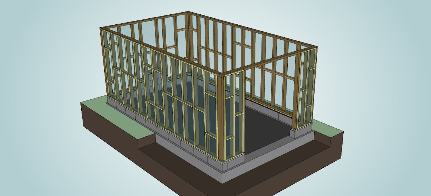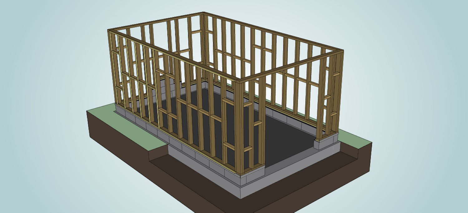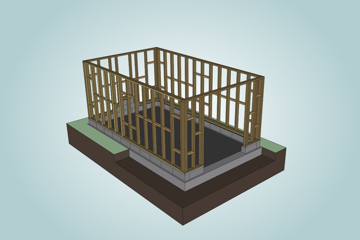 De fire hjørnestolpene lages av to 48 x 123 mm bjelker (D). De festes til bunnsvillen (G og A) med kraftige vinkelbeslag.