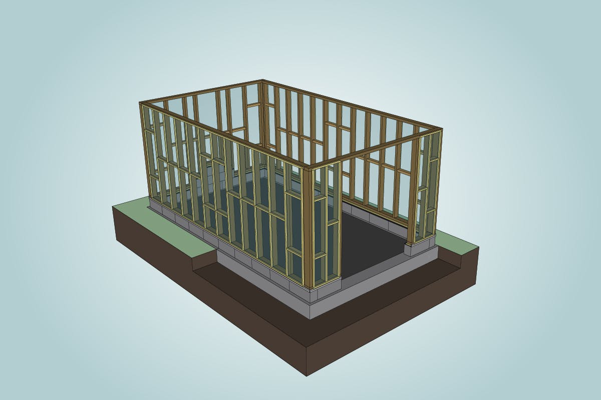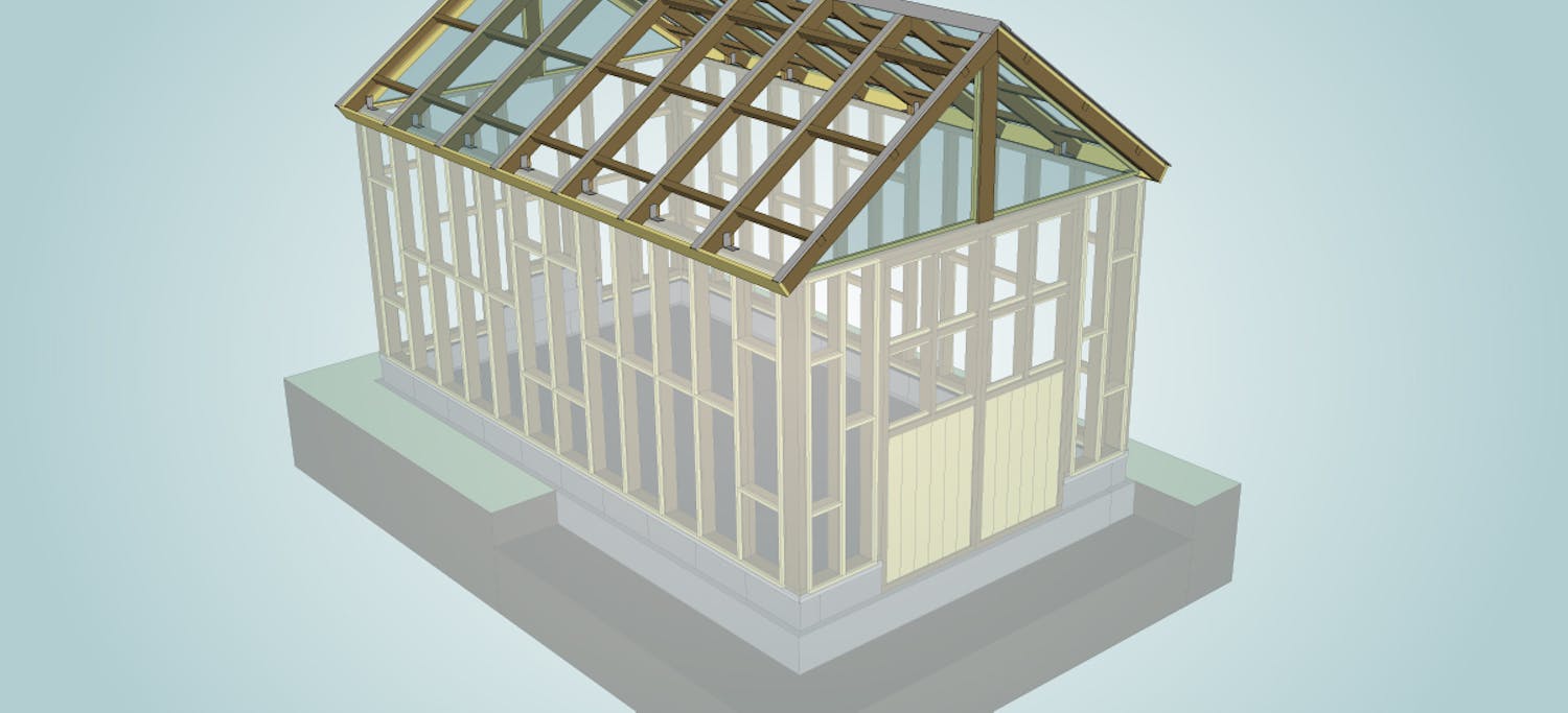 Orangeriets vegger bygges opp som et skjelett av tre, som glassene kittes fast i. De vannrette lektene forskyves, for å skape litt variasjon.