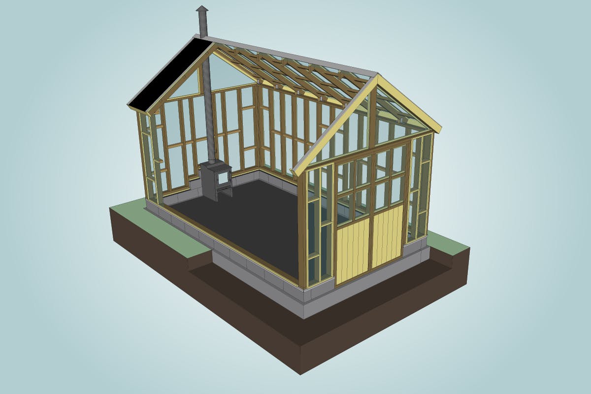 Det siste faget i taket får et tak av kryssfinér med takbelegg i stedet for glass. Det gjør det mulig å føre ei stålpipe opp gjennom taket, slik at det blir mulig å fyre opp i en vedovn i orangeriet på kjølige dager.
