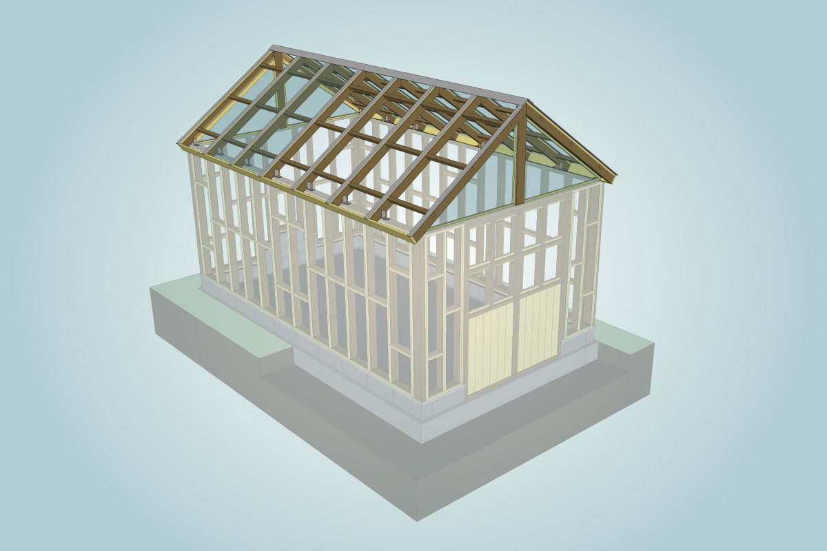 Taket på orangeriet lages som et treskjelett som bærer rutene, slik som på veggene. Forkantbordet bærer både takfotbeslaget og takrennene.