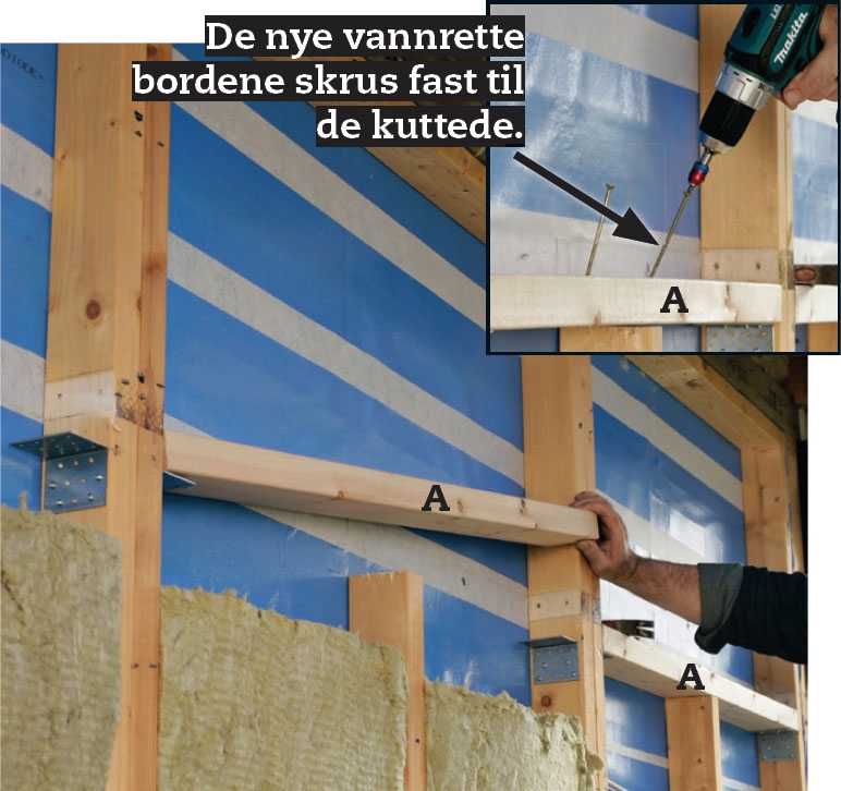 De nye loddrette plankene (B) settes fast med lange skruer i de vannrette bordene over og under. Her klarer vi oss uten beslag, for vekten går loddrett fra tre til tre, skruene holder det bare på plass.