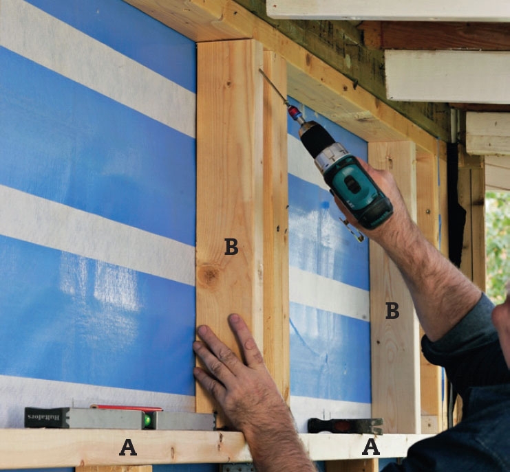 De nye vannrette bordene (A) i skjelettet settes fast til de loddrette stenderne med solide vinkelbeslag. Bruk som alltid riktige beslagskruer i beslagene, og vær nøye med ikke å sette dem så tett eller langt ut at de sprekker opp treet.