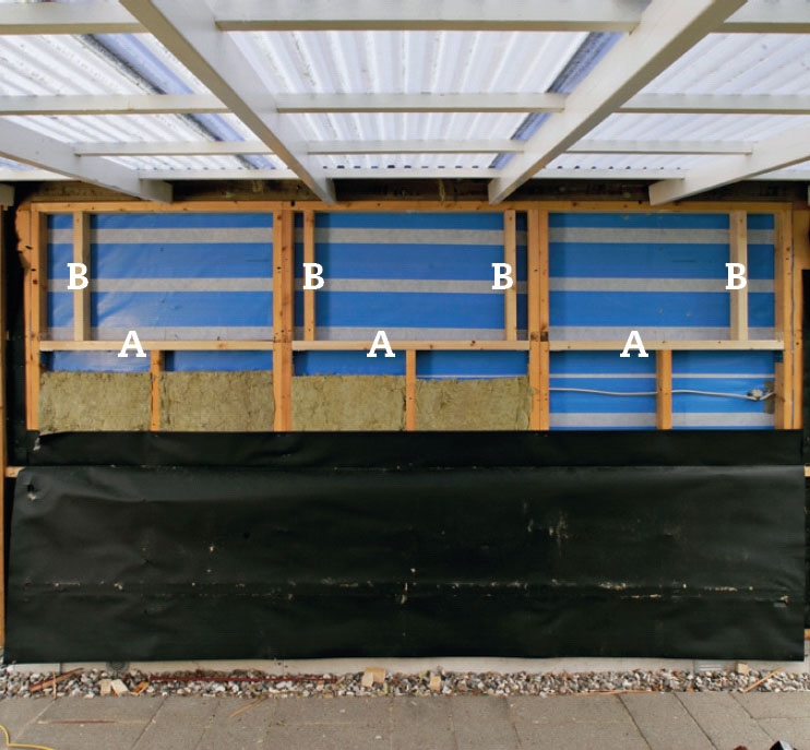 Det innerste isolasjonslaget ligger inne mellom loddrette stolper. For å unngå kuldebroer, setter vi de supplerende 50 mm isolasjonsplatene mellom et lag vannrette avstandslekter, skrudd utenpå de loddrette stolpene.