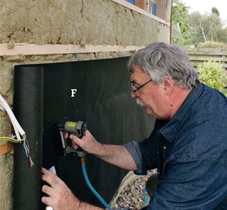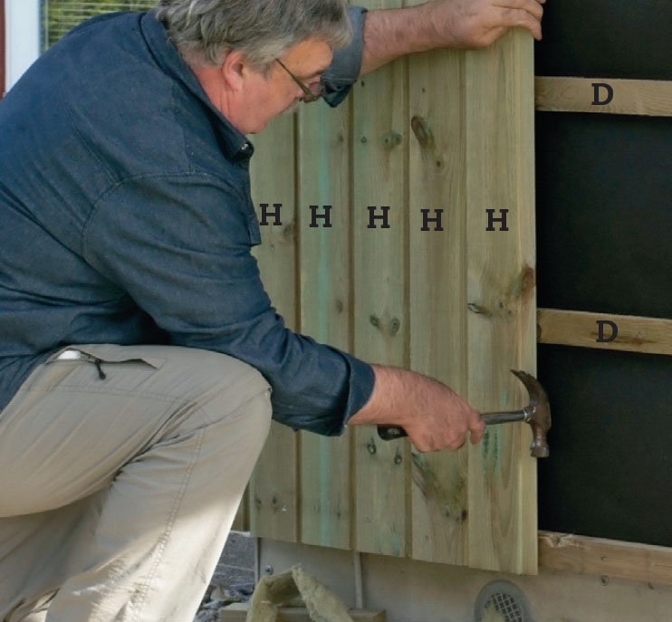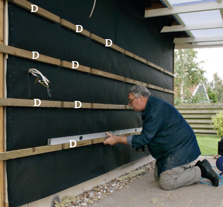 Utenpå vindpappen skrur vi et lag avstandslister (D) oppå de vannrette lektene (C). De skal sikre ventilasjon bak kledningsbordene. De deles derfor i korte stykker som settes med litt avstand mellom.