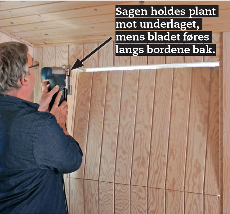 Vindushullet sages ut i den innvendige kledningen. Vi trekker først streker mellom de fire hullene vi boret i hjørnene fra utsiden. Deretter kan vi stikke sagbladet inn i et av hullene og sage løs.