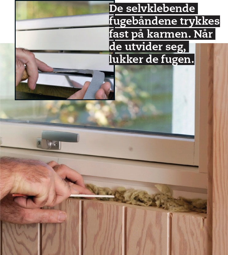Fugene lukkes utvendig og innvendig. Når kilene er fjernet, stoppes mineralull inn i fugen. Innvendig lukker vi med en akrylfuge, som legges oppå et rundt fugebakstopp. Utvendig lukker vi med ekspanderende fugebånd.