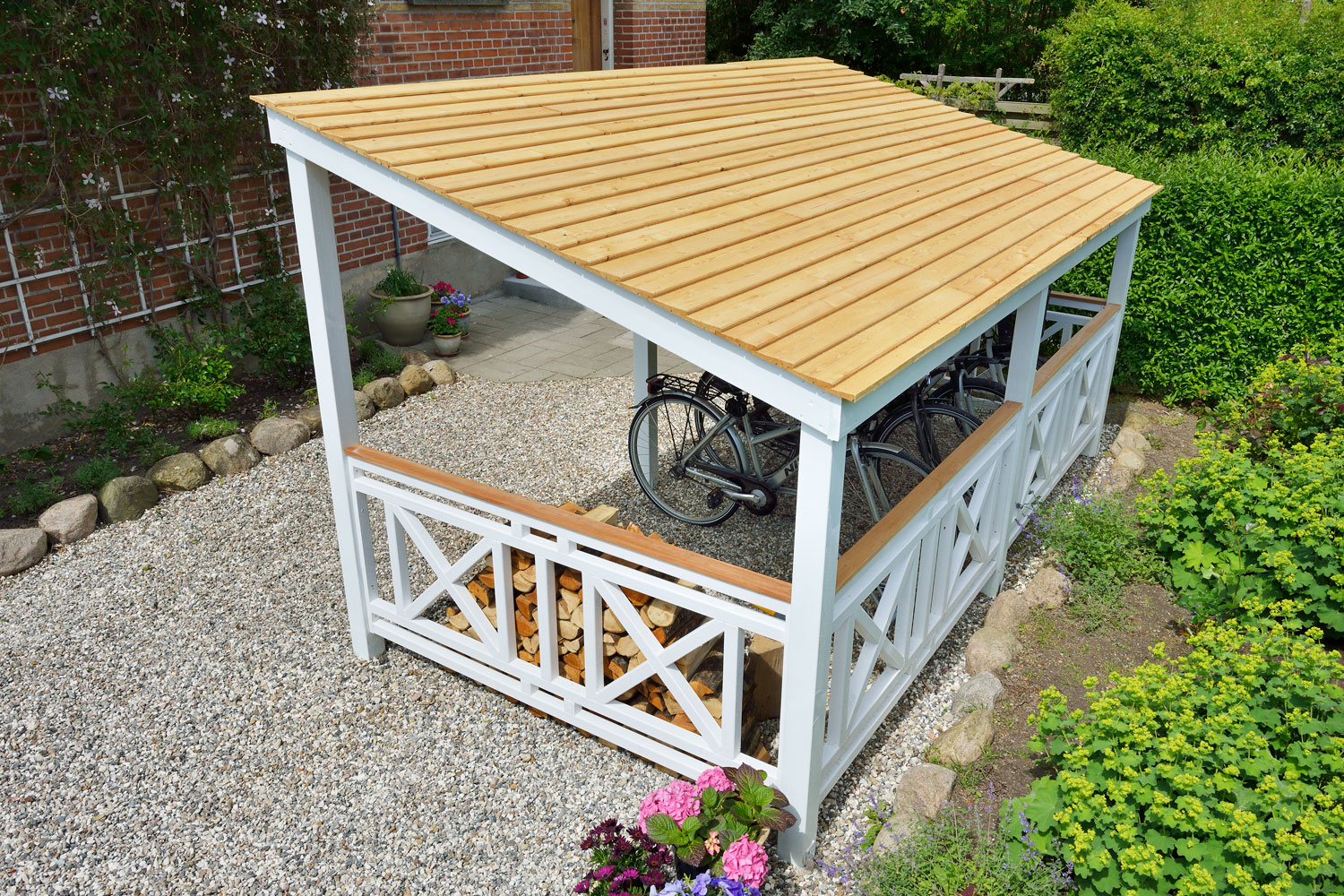 Du kan for eksempel bygge et klassisk sykkelskur, et halvtak til sykler, et sykkelstativ med blomsterkrukker, sykkeloppheng til kjelleren eller et lite sykkelskur i tre, der syklene står på høykant.