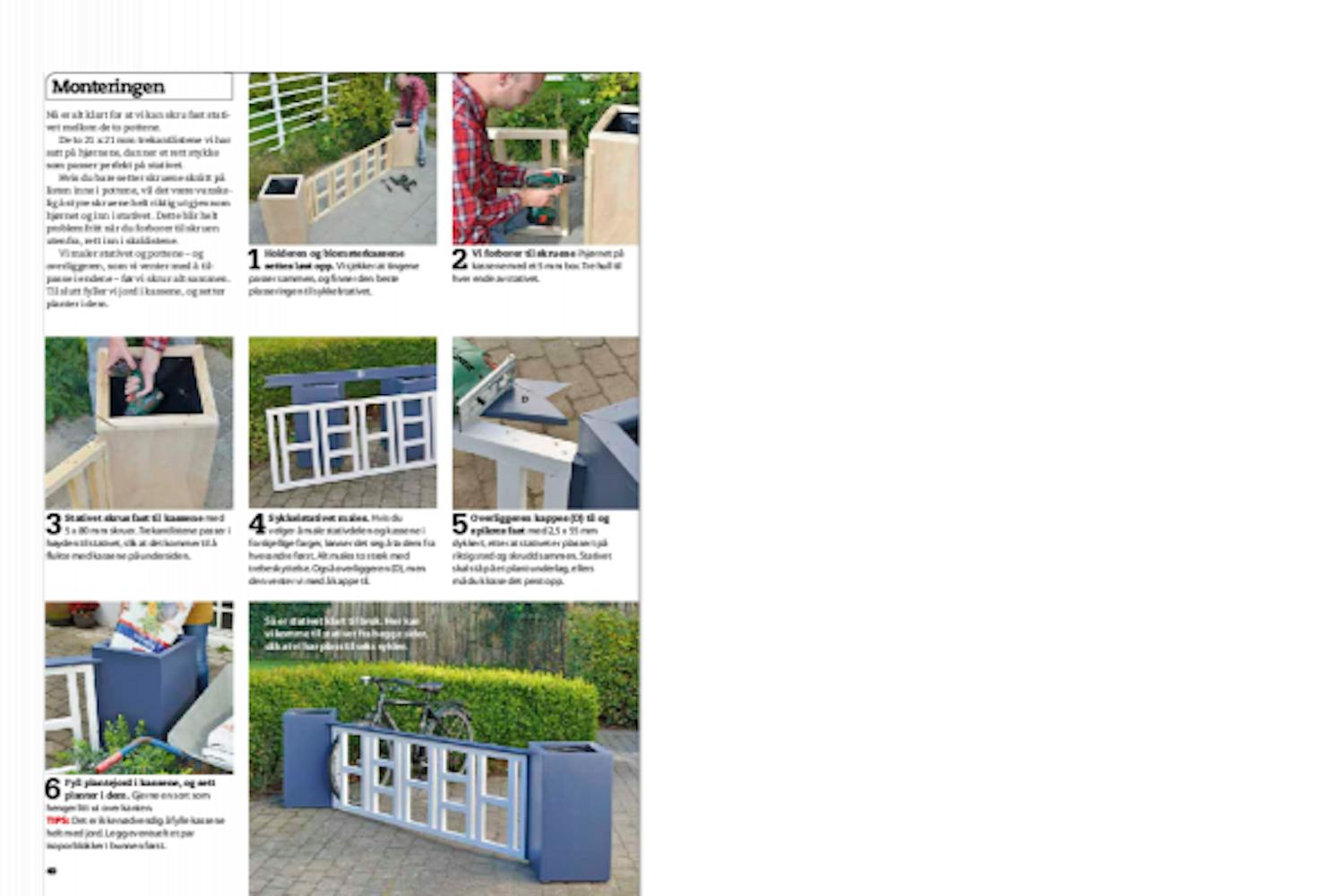 Holderen og blomsterkassene settes løst opp. Vi sjekker at tingene passer sammen, og finner den beste plasseringen til sykkelstativet.