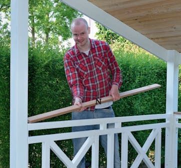 Bordene får treolje før de spikres på. Det øvrige treverket males to strøk med en heldekkende trebeskyttelse.