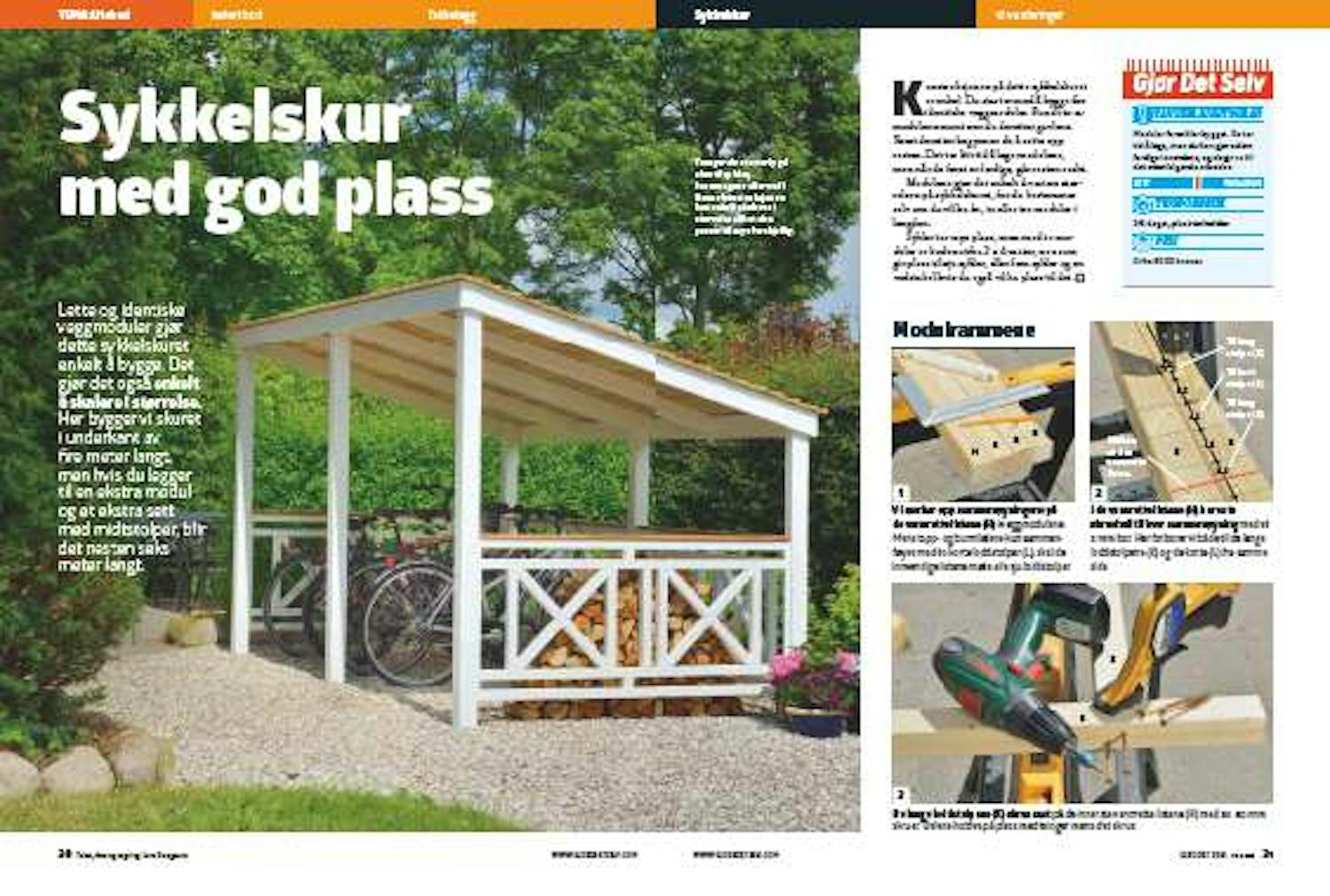 Kloss opp gavlen, og kapp til stolper (A og B) og yttersperre (D) med skrå snitt. Forsiden på den lange stolpen (A) skal være 205 cm, og langsiden på den korte stolpen (B) blir 150 cm. Yttersperren (D) skal flukte med stolpene.