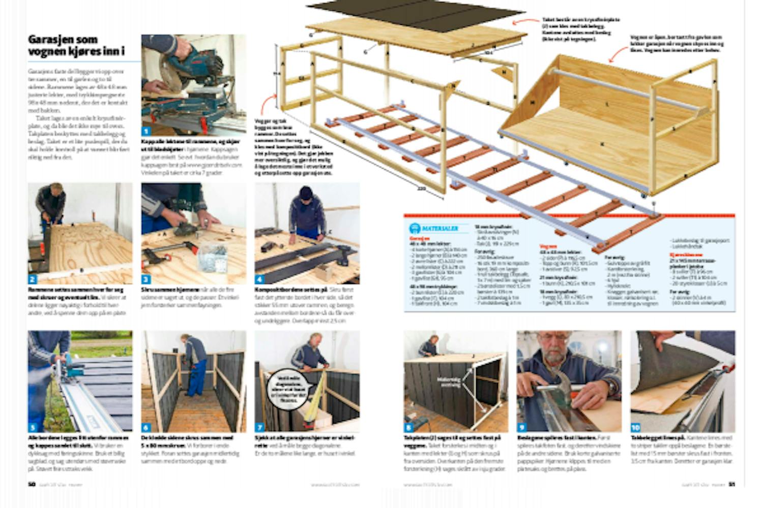 Vegger og tak bygges som løse rammer. De settes sammen hver for seg, og kles med komposittbord (ikke vist på tegningen). Det gjør jobben mer oversiktlig, og gjør det mulig å lage det meste inne i et verksted og etterpå sette opp garasjen ute.