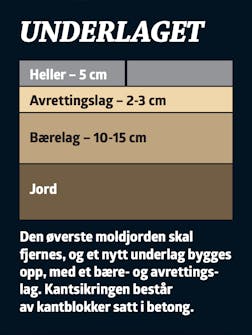 Oppbyggingen er ganske enkel. Stein på toppen, avrettingsgrus i et lag på 2-3 cm og et bærelag på 10-15 cm nederst.