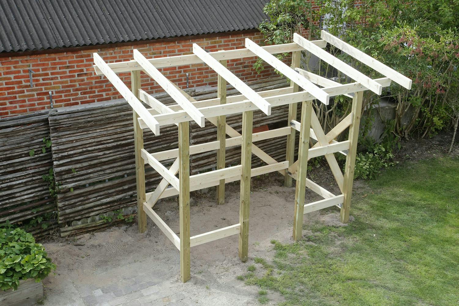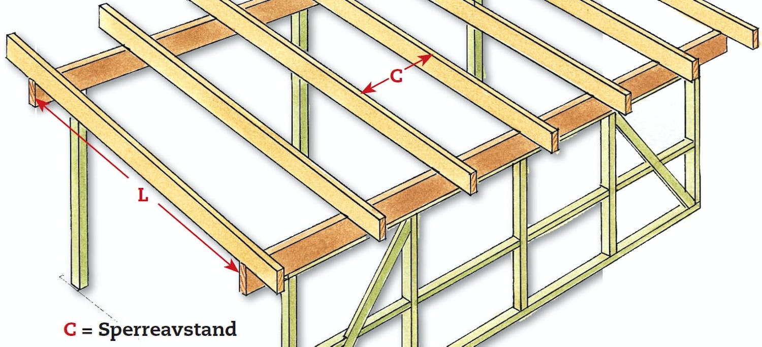 Dette er en bygning (carport) med stolper bakerst og en vegg med bindingsverk framme. L er spennvidden mellom toppsvillene. C er sperreavstanden fra midten til midten, og den er vanligvis 60 cm.
