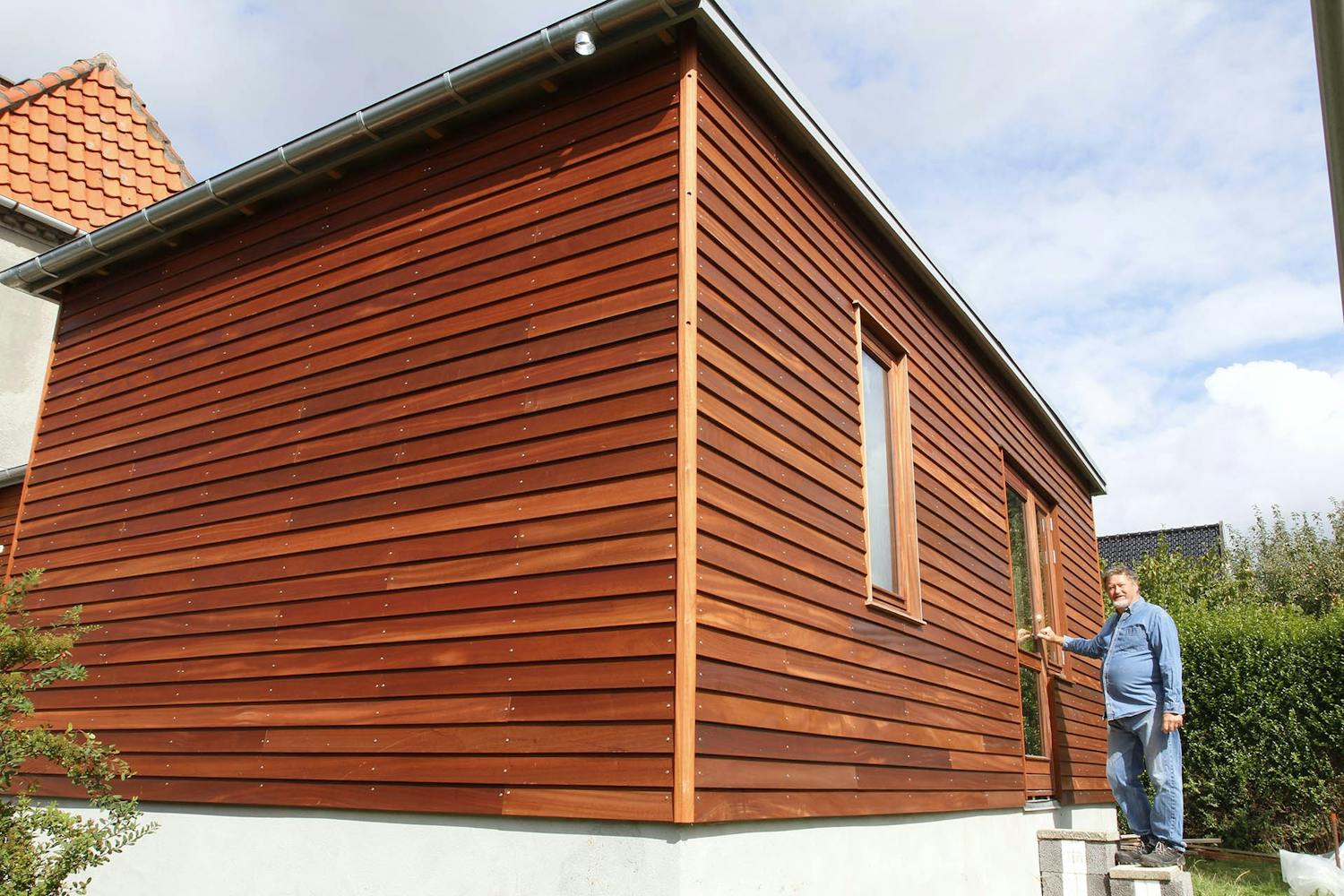 Slik gjør du: Skråskåret liggende kledning har en fals, så bordene passer pent i hverandre. Du kan også legge vanlige ru bord med overlapp etter samme prinsipp. Det gir et litt grovere uttrykk.
