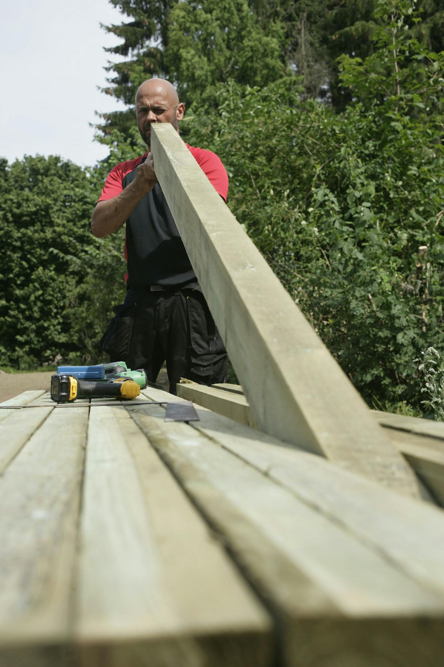 Viktig: Fordi hvert bord sitter litt skrått på grunn av overlappet, skal du være nøye når du skrur, slik at du skrur i den vinkelen bordet ligger. Da havner skruehodet i plan med overflaten på bordet.