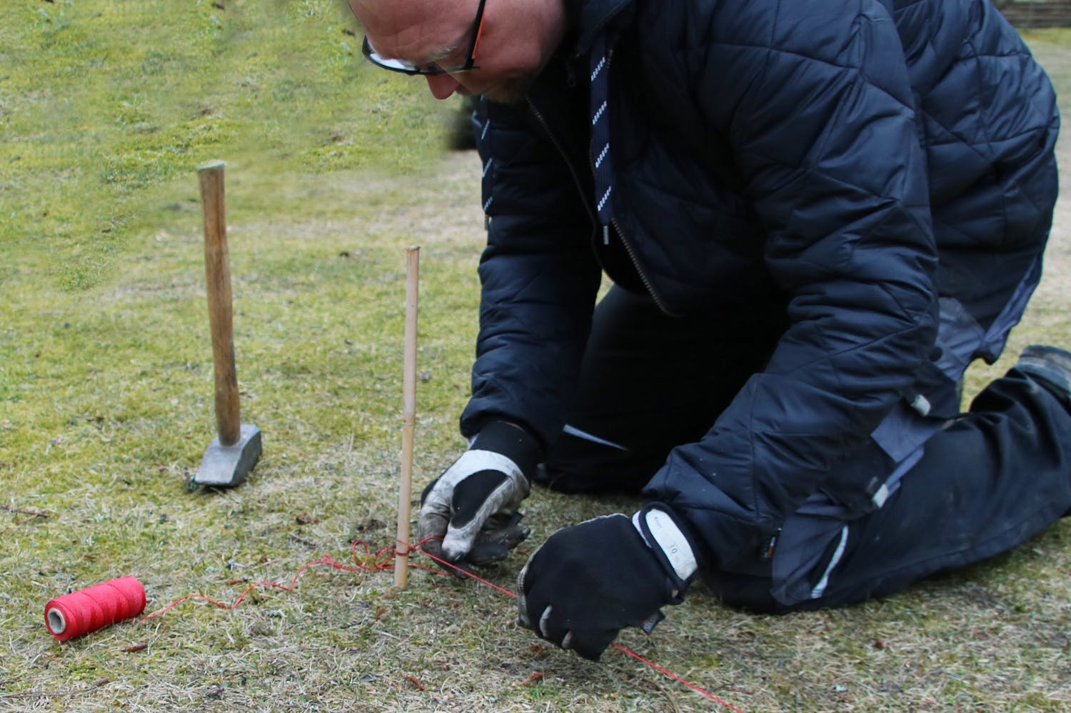 3-4-5-regelen sier at hvis den ene siden i en trekant er 3 meter og den andre 4 meter, så skal den tredje være 5 meter for at trekanten skal være rettvinklet. Du trenger altså bare å tenke på 3-4-5 – eller 1,5-2-2,5, hvis det passer bedre med de aktuelle målene hos deg. Du kan raskt lage en trekant etter disse prinsippene, som du retter inn markeringene etter. Da er du sikker på at tingene blir rettvinklet.