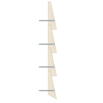 Skruene som holder overliggerne fast, er plassert minst 25 mm fra kanten og skrus inn mellom underliggerne og direkte inn et spikerslag eller en avstandslist. Her er skruene minimum tre ganger bordets tykkelse.