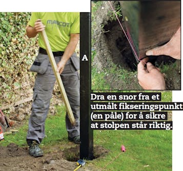 Mål opp. Tegn opp stolpenes plassering på en lang lekt. Nå kan du helt presist sette ned stolpen i motsatt ende, før du trekker en snor mellom stolpene, slik at du får resten på en rett linje.