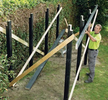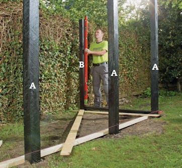 Sett ned resten av de lange stolpene (A) langs forsiden av skjulet. Rett inn stolpene etter en snor, finn den innbyrdes avstanden med markeringene på lekten og stamp dem fast i loddrett posisjon. Her er det en stor fordel å være to.