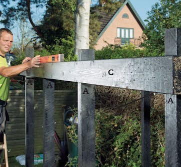 Fortsett med de korte stolpene (B) på baksiden. Mål først vinkelen til hjørnestolpen nøye. Med en 3:4:5-vinkel av en lekt og et par forskalings bord, samt en avstandsplanke mellom de to hjørnestolpene, treffer du helt riktig.