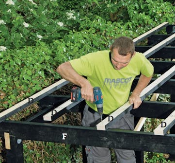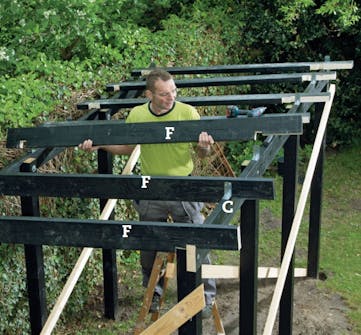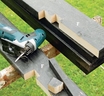 Sag hakkene i sperrene (F). Følg strekene nøye med en stikksag. Det ekstra hakket på den øverste sperren passer over en stolpe.