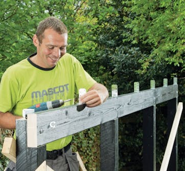Start med å sage til stolpene i høyden før du bygger videre. De fremste skal rage 212 cm over bakken, de bakerste skal være rundt 15 centimeter kortere.