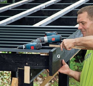 Sett på forkantbordet (G). Legg opp en takplate slik at du enkelt kan sette bordet i riktig høyde. Bordets overkant skal flukte med toppen av bølgene i platene. Skru fast forkantbordet med 5 x 90 mm skruer inn i sperrene.