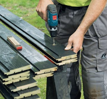 Forbor i kledningsbordene (K). Skruene skal sitte 35 mm fra not kanten og midt i losholten. Forbor med et 4,5 mm bor. Hullene i sperren kan du vente med til il du har satt opp bordet.