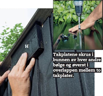 Legg på takplatene. Overlappsbølgen skal ligge oppå vindskien (H). Siden vi venter med å sette den på, styrer vi platene på plass med en kort bit av bordet.