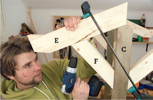 Forbor med et 4 mm bor skrått gjennom takstøtten (F) og inn i stolpen (C). Skru den fast med 4,2 x 75 mm skruer. Mål opp takstøttens plassering på stolpen, og skru fast resten i samme høyde.