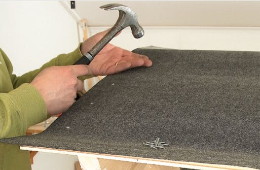Takbelegget spikres fast med pappspiker. Bordene er 22 mm tykke, så vi bruker spiker som er 20 mm lange. Spikerne plasseres så tett på kanten som mulig, uten at bordene sprekker.