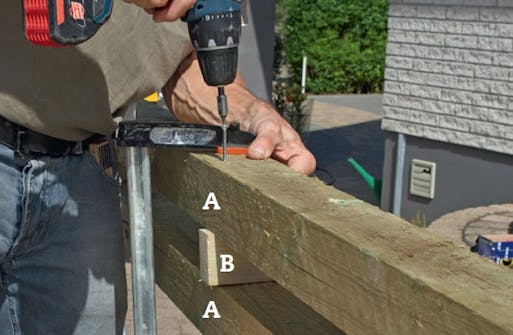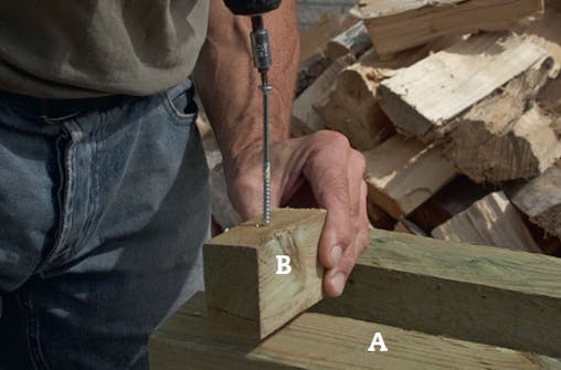 Den andre stolpen (A) skrus til klossene (B) med 120 mm lange skruer. Fortsett med de neste stolpene. Se over stolpene, og finn de som passer best sammen, så åpningen blir jevn hele veien.
