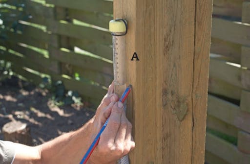 Vi merker først opp en felles høyde på alle stolpene (A), et såkalt måleplan. Bruk et laservater eller et slangevater. Høyden er uten betydning - du måler opp alle høyder ut fra måleplanet.
