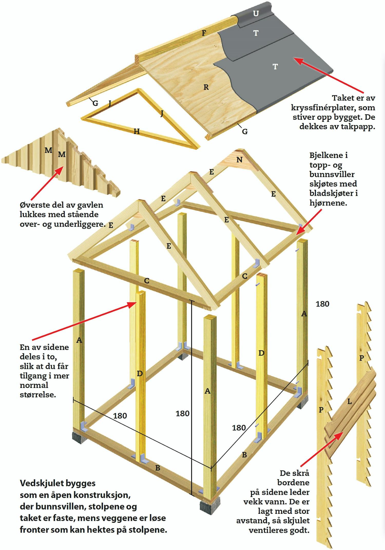 Det loddrette snittet i mønet lager du med kappsagen, mens salhakket sages ut med en stikksag eller håndsag. Lag fem tilsvarende sperrer til. Lag deretter de tre laskene (N) av 18 mm kryssfinér.