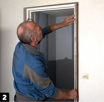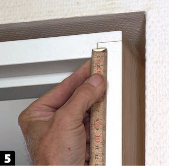 Marker på karmen hvor utforingslistene skal sitte. Målene skal følge karmen, som vi antar er i vater. Hvis karmen ikke er i vater, skal listen heller ikke være det. Trekk listene 6 mm inn fra kanten av karmen.