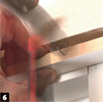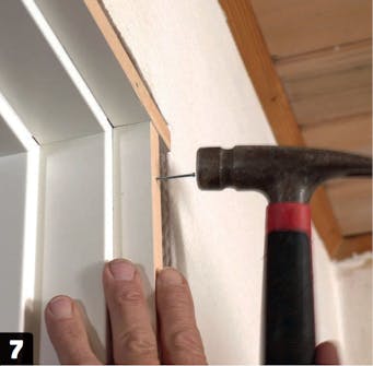 Spikre fast listene til karmen. Begynn med en spiker i den ene siden. La listen sitte løst nok til at du kan finjustere plasseringen i motsatt side, før du spikrer den fast der. Til slutt spikres den fast på midten.