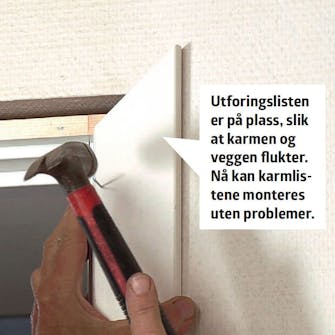 Begynn med å måle hvor brede utforingslistene skal være. Legg en vinkel mot veggen, og mål avstanden fra karmen ut til vinkelen. Ta mål i både toppen, bunnen og på midten, for å få med deg skjevheter.