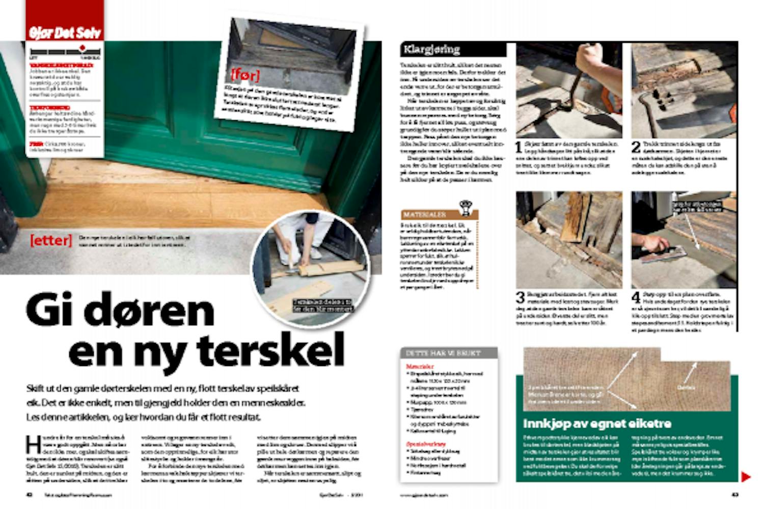 Den gamle terskelen skal du ikke kassere før du har kopiert svalehalene over på den nye terskelen. Da er du nemlig helt sikker på at de passer i karmen.
