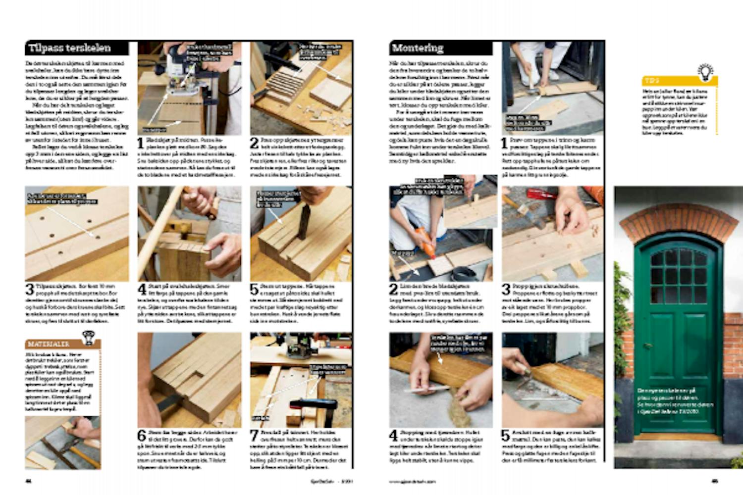 Tilpass skjøten. Bor først 10 mm propphull med et skarpt trebor. Bor deretter gjennom til skruenes slanke del, og husk å forbore der skruene skal bite. Sett terskelen sammen med rust- og syrefaste skruer, og fres til slutt ut til dørfalsen.