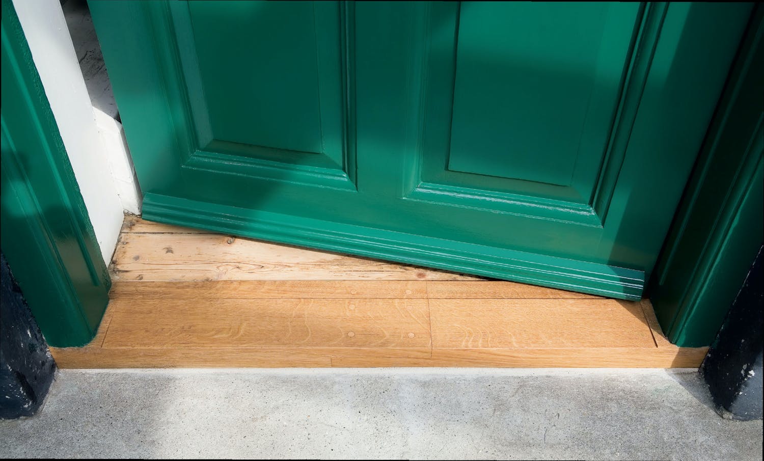 Terskelen er slitt hult, slik at det nesten ikke er igjen noen fals. Derfor trekker det inn. På undersiden av terskelen ser det enda verre ut, for der er betongen smuldret, og trinnet er angrepet av råte.