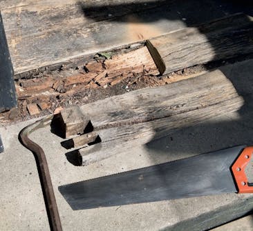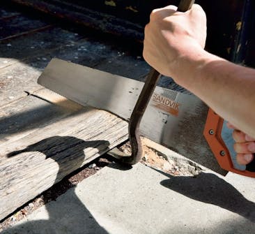 Skjær først av den gamle terskelen. Legg håndsagen litt på skrå, slik at den ene delen av trinnet kan løftes opp ved snittet, og sett et brekkjern under, slik at treet ikke klemmer rundt sagen.