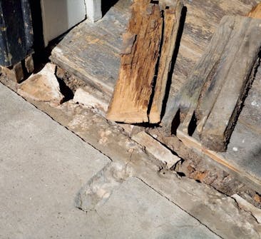 Rengjør arbeidsstedet. Fjern alt løst materiale med kost og støvsuger. Merk deg at den gamle terskelen bare er råtnet på undersiden. Øverste del er slitt, men treet er sunt og hardt, selv etter 100 år.