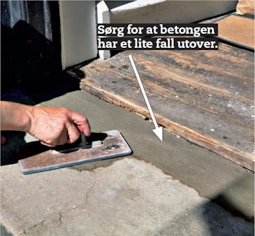 Når terskelen er kappet av og forsiktig lirket ut av karmene i begge sider, skal bunnen repareres med ny betong. Sørg for å få fjernet all løs puss, og støvsug grundig før du støper hullet ut i plan med trappen. Pass på at den nye betongen ikke heller innover, slik at eventuelt inntrengende vann blir stående.
