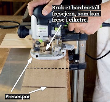 Fallet lager du ved å klosse terskelen opp 3 mm i den ene siden, og legge en list på hver side, slik at du kan føre overfresen vannrett over freseområdet.