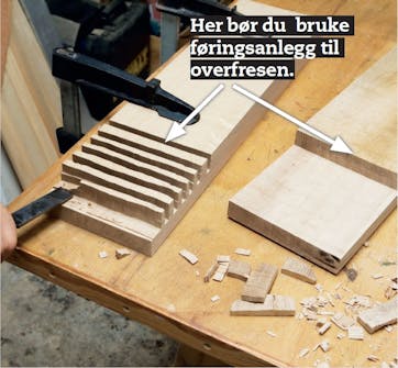 Stem fra begge sider. Arbeidet hører til det litt grovere. Derfor kan du godt gå litt friskt til verks med 2-3 mm tykke spon. Snu emnet når du er halvveis, og stem ut resten fra motsatt side. Til slutt tilpasser du trinnets lengde.
