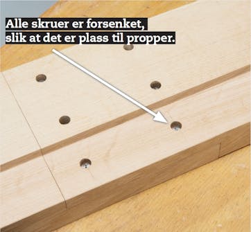 Propp igjen skruehullene. Proppene er flotte og beskytter treet mot stående vann. Her brukes propper av eik laget med et 10 mm proppbor. Drei proppene slik at årene går som på terskelen. Lim, og slå forsiktig til bunns.